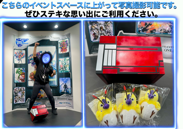 店内はPSOの世界観を再現した展示・フォトスポット(特に「赤箱」スペシャルステージでラッピーと撮影可能!)で彩られ、5,000円以上購入で特典イラストカード(全3種類よりランダムにて1枚)もプレゼントされました。